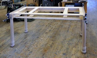 the new onw was starting to take shape by last friday ... still a long way to go though .. lots of detail. and trevor whipped up this little 'rustic' coffee table last week. it may not look so rustic in this photo, but now the base is distressed and pickled, the top has its breadboards, and the culry maple top will be distressed, stained and finished later this week.